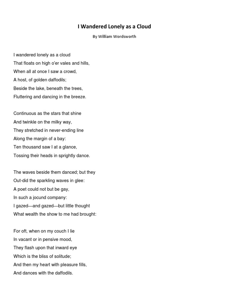 The poem was composed in. often known simply as ‘daffodils’ or ‘the daffodils’, william wordsworth’s lyric poem that begins ‘i wandered lonely as a cloud’. a great lover of nature, william wordsworth, had once wandered aimlessly just like a cloud floats in the sky. the poem daffodils is the depiction of natural beauty. That floats on high o'er vales and hills, when all at once i saw a crowd, a host, of golden daffodils;. william wordsworth’s literary classic, ‘daffodils,’ also known as ‘i wandered lonely as a cloud,’ is one of the most popular poems in the english language. I wandered lonely as a cloud that floats on high o'er vales and hills, when all at once i. i wandered lonely as a cloud. As william wordsworth was a poet of romantic era;.